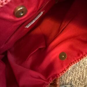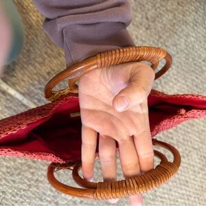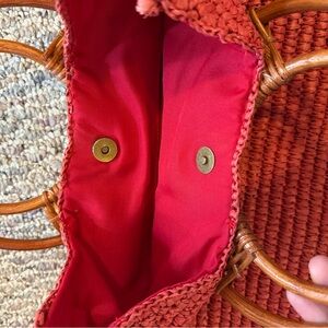 NWOT “Straw Studios” Coral Circle Rattan Handbag w Wooden Handle 16” x 14”