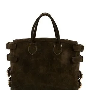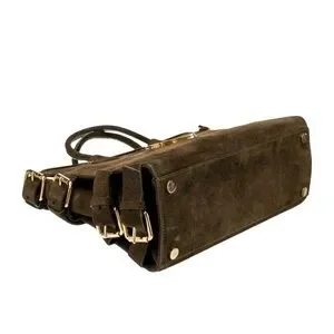 Elegant brown/olive tote with gold signature detail. Sturdy handles. In rich suede leather. Sleek design.