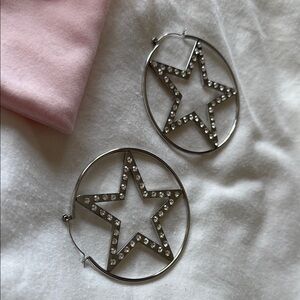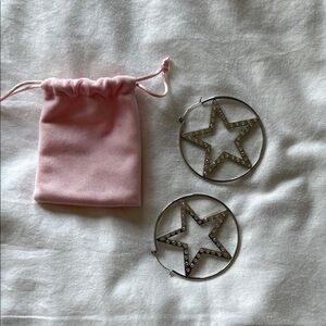 Stylish silver hoop earrings with star design. Perfect for any occasion. No rhinestones missing in front and back. Comes with pink cute pouch