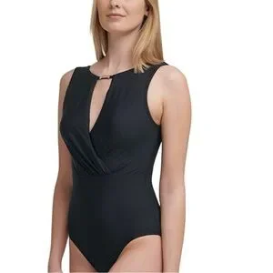 This sleek black one-piece swimsuit by Calvin Klein features a stylish plunging V-neckline with a wrap-style front, offering a chic crossover effect. The bodice is designed with subtle ruching for added texture and shaping, ensuring a flattering fit. Crafted from stretchy material, it provides comfort and ease of movement, making it perfect for swimming or lounging by the pool.
