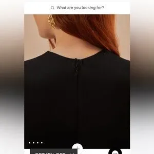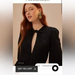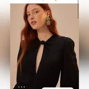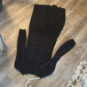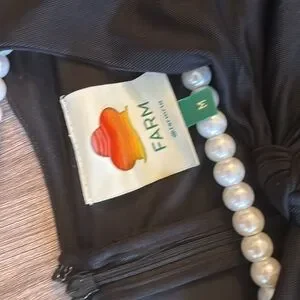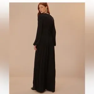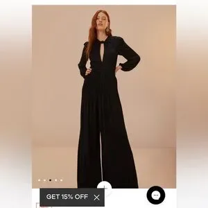 This sophisticated black jumpsuit by FARM Rio features long, wide-leg palazzo pants that flow elegantly, complemented by a tailored blazer-like top with lapels. The belted waist adds definition, making it perfect for formal occasions or upscale events.