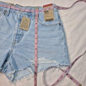 Levi's 501 Women's High Rise Jean Shorts in size 29, featuring a distressed denim design in a classic blue color. These shorts have a button closure, flat front, and are made of 100% cotton. They have a regular fit with a high rise waist, accented with buttons and the Levi's logo. These shorts also include pockets and are suitable for various occasions like activewear, casual wear, walking, or beach outings.