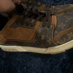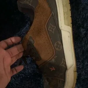 Experience luxury with these Louis Vuitton sneakers, showcasing the iconic brown monogram pattern. Crafted with premium materials, they feature a classic low-top design and a comfortable lace-up closure. The cream rubber soles add a touch of contrast, making them a stylish choice for any casual outing. Small cracks in canvas as shown but not noticeable