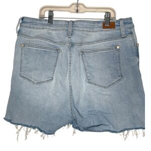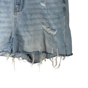These stylish jean shorts feature a distressed design with a raw, frayed hem and a casual cut-off style. The light blue color and mid-rise waist make them perfect for a laid-back summer look.