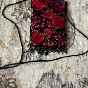 Elegant floral velvet crossbody bag with a striking red and black design. Perfect for adding a touch of sophistication to any outfit.