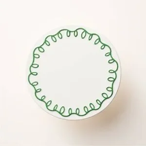 “Elevate your dining experience with this Kate Spade cake stand, featuring a minimalist design in white with a green trim. Its elegant silhouette and sturdy pedestal base make it perfect for showcasing desserts or serving dishes at any gathering.”