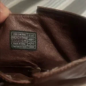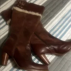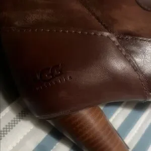 Experience timeless style with these UGG brown heeled boots, crafted from smooth leather for a polished look. The medium-height heel and sleek silhouette make them perfect for formal and business casual occasions. A lighter trim adds a touch of sophistication to these classic boots.