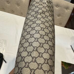 This Gucci tote bag showcases a timeless design with its cream and brown color palette, featuring the iconic GG monogram canvas. The structured shape and brown leather trim add elegance, while the gold-tone hardware provides a touch of luxury. Perfect for everyday use, this bag combines style and functionality effortlessly. It has rubs on corners, missing zipper stopper (but zipper still opens & closes), worn leather top trimmings and peeling inside but still has a lot of life left.