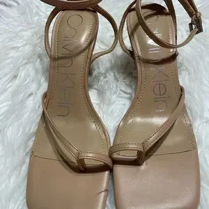 These Calvin Klein sandals feature a timeless tan color with secure ankle straps. Ideal for any outfit, the 3.25-inch heel offers both comfort and style.