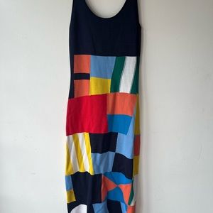 Vibrant colorblock midi dress by STAUD. Features a sleeveless design with a fitted bodice. Perfect for a bold, stylish look.