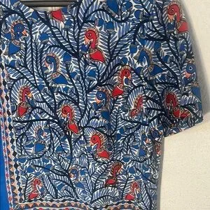 This casual dress by Tory Burch features a striking asymmetrical design with a vibrant blue and white color palette. The short-sleeved sheath dress is adorned with a unique pattern, offering a modern twist to a classic silhouette. Its crew neck and asymmetrical print placement make it a standout piece for any casual outing.