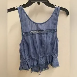 This charming blue tank top from Free People features a stylish tie front and delicate ruffled detailing. The sleeveless design offers a breezy feel, while the flowy silhouette adds a touch of bohemian elegance. Perfect for casual outings, this top combines comfort with a chic, feminine flair.