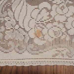 Vintage white lace 39" X 13" table runner. Beautiful on any table used with a display. (Does have a couple spots in which I did not try to remove). Very pretty pattern. Preowned. Non smoking home.