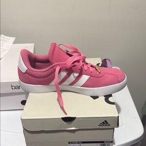 These Adidas sneakers feature a striking pink color with a classic low-top silhouette, perfect for casual outings. The shoe's vibrant pink upper is complemented by white laces and a clean white midsole, offering a fresh and stylish look. A subtle metallic accent adds a touch of elegance to these standout sneakers.