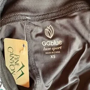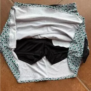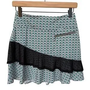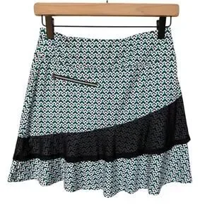 GG blue athletic skort is NWT and no flaws noted. This skort is made from lightweight performance fabric and features a geometric print coupled with an asymmetric black mesh ruffle. It has one zip pocket in front and one in back. Be functional and fashion forward in this cute skort. Measures app'x: 13 inches across waist and 16 long. Tags: Athleisure, Golf, Pickleball, Resort Wear, Feminine
