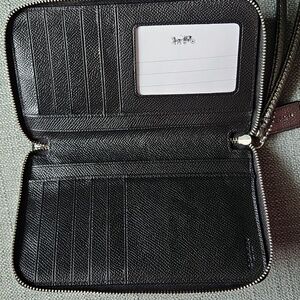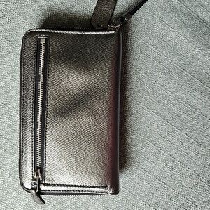 Elegant Coach wristlet in shimmering silver. Compact design with convenient wrist strap.