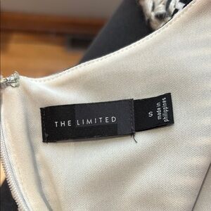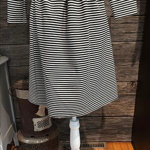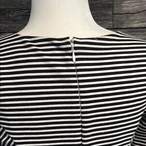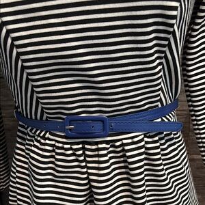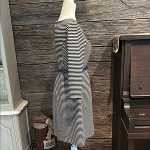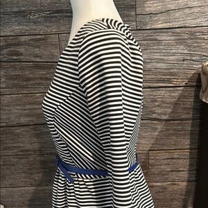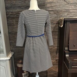 Black and white striped dress. 3/4 sleeves, v-neck. Blue belt is detachable. Zipper in back, lined on top. Fabric has good stretch