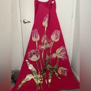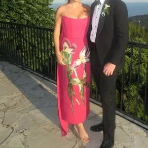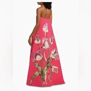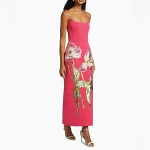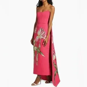 This exquisite Amsale gown from their SS25 collection in a vibrant pink hue is perfect for a wedding guest. The strapless design features a structured bodice and a dramatic A-line silhouette with a high-low hemline and removable train to make it perfect for dancing. Adorned with a beautiful sequin floral motif, the dress showcases green botanical accents for a touch of elegance. Like-new: only worn once to a wedding, and received endless compliments all night. Purchased in April 2025 for $2,640. Open to offers, but no low ballers