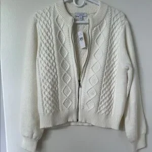 Experience the elegance of Ann Taylor's cream cardigans, featuring intricate cable knit patterns and classic ribbed cuffs. These cardigans offer a timeless design with a cozy, textured knit, perfect for adding warmth and style to any outfit.