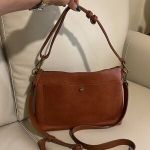 Tan leather, brass hardware, two straps. Can be worn as a tote or crossbody. Minor wear at bottom corners.