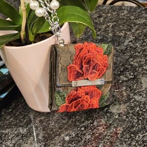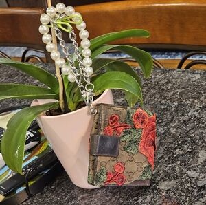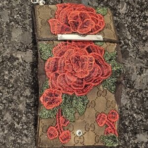 Vintage Gucci wallet featuring red floral embroidery patches. Includes a pearl chain for easy carrying. Well loved, see all images.