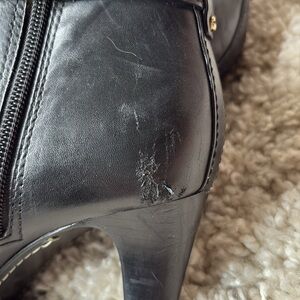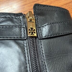 Elevate your style with these Tory Burch black heeled boots, featuring a sleek design and a high stiletto heel. The boots showcase a subtle gold-toned circular hardware detail near the ankle, adding a touch of sophistication. Perfect for formal occasions, these boots combine elegance with a classic silhouette.
