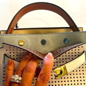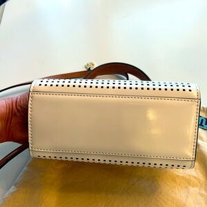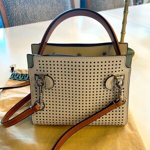 Pristine condition! Purchased last year and have carried to church three times. It’s just too petite for me. White perforated exterior, light blue suede accents, divided interior with card holder. 3 snap closure and TB “belt”closure. Top handle plus removable crossbody strap. Comes in original sleeper bag. See dimensions in last photo.