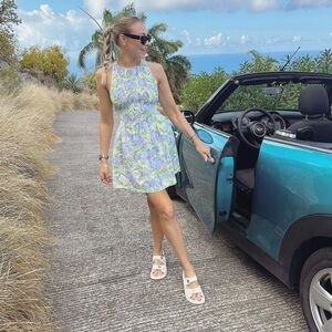 Chic mini dress by Hill House. Features a floral pattern. Sleeveless with a fitted bodice. Perfect for warm weather.