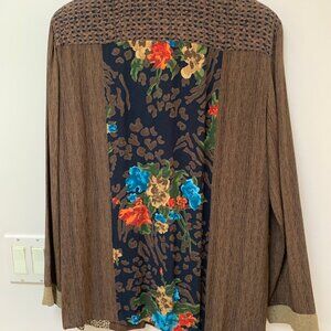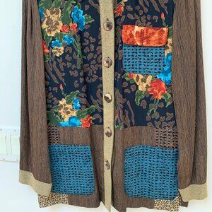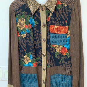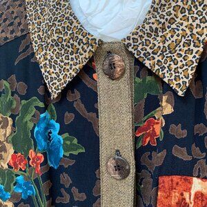 This vintage Carole Little long sleeve jacket shows an exquisite array of flowers interspersed with geometric designs and accented with the leopard print of the slacks.