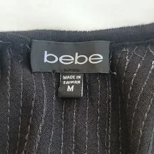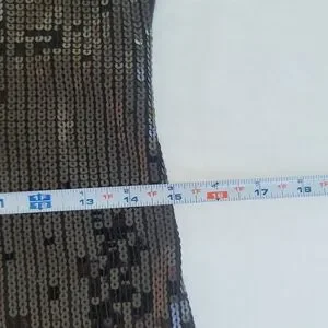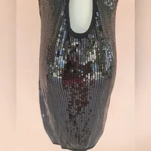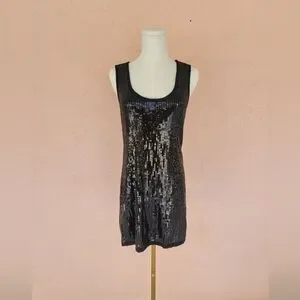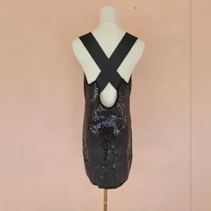 Gorgeous and sparkly, Bebe black sequins minidress. Worn once, in excellent condition. This dress is made from 80% Rayon and 20% Spandex, and it is super stretchy. Size Medium, but will definitely fit a Large as well. The straps in the back are comfortable and made from elastic, so they have a lot of stretch as well. Perfect summer dress for all events. Please see pictures for measurements and as part of the description as well.