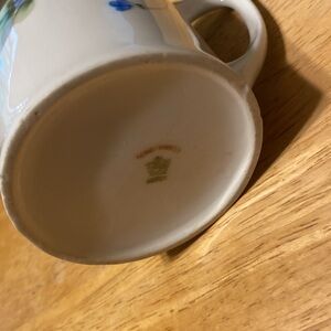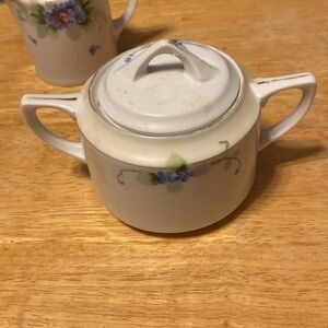 Elegant floral creamer and sugar bowl set with blue and green accents. Nippon cream and sugar set about 3 inches tall good condition but gold trim is wearing off. One little flaw on creamer bottom