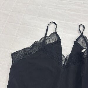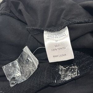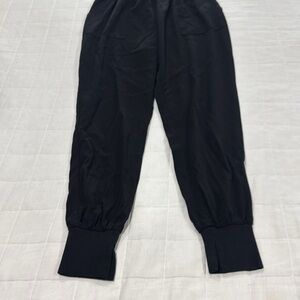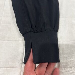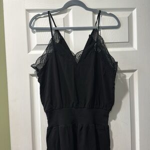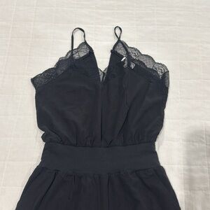 Very nice women’s black jumpsuit size M in great condition. It has one very small hole by the pocket that is not very noticeable (see last picture)