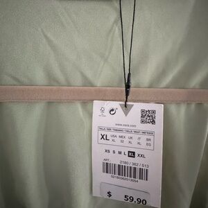 NEW This stunning light green dress by Zara is perfect for a wedding guest or cocktail event. It features a flattering V-neckline and an asymmetrical design with elegant ruching and pleating details, and open mid back. The flowing fabric add a touch of sophistication to this chic dress.