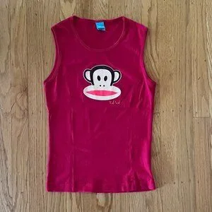 Paul Frank muscle tank top features screen printed Julius the Monkey graphic on front. 100% cotton. Red.