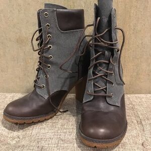 Brand new never worn. Experience the perfect blend of rugged style and modern elegance with Timberland's brown and gray heeled boots. Featuring a two-tone design with gray canvas and dark brown leather accents, these boots boast a chunky 3-4 inch stacked heel for a fashion-forward look. The lace-up front with metal eyelets adds a touch of classic Timberland charm, making them a versatile addition to any wardrobe.