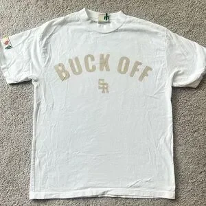 This white short sleeve tee features a bold 'BUCK OFF' graphic on the front, making it a standout piece for casual wear. Crafted in a classic crew neck style, it offers both comfort and style for everyday outings.