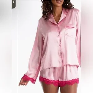 Felicity Lace Trim Long Sleeve Satin Shorts Pajamas.