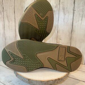 The PUMA Rs-X Shades of Lace Up Sneakers Shoes in Camo Dye, size 10 for men, offer a stylish and comfortable option for athletic activities. With a camouflage pattern, lace-up closure, and rubber outsole, these sneakers feature a standard shoe width for a good fit. The green color and breathable fabric lining make them both fashionable and practical for gym training or running. The PUMA RS-X model is part of the PUMA RS product line, known for cushioned support and performance in sports-themed activities.