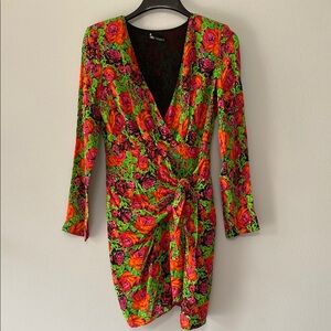 Step into the spotlight with this stunning Zara bodycon dress, perfect for a cocktail night out. Featuring a vibrant mix of red and green, this dress boasts a flattering V-neckline and long sleeves. Its form-fitting silhouette and elegant ruching detail make it a standout choice for any festive occasion.