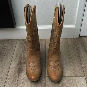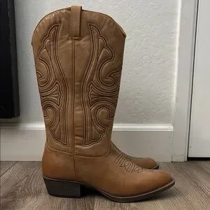These Altar'd State boots feature a classic western silhouette with a slightly pointed toe and a walking heel. Crafted in a rich tan leather, they showcase traditional western-style stitching and a smooth, slightly distressed finish for an authentic look.