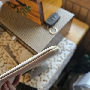 Chic white leather pouch featuring a Snoopy motif. Adds charm to any ensemble...see pics,I did carry a few times..stored smoke free home,super rare and cute!!! 10x7