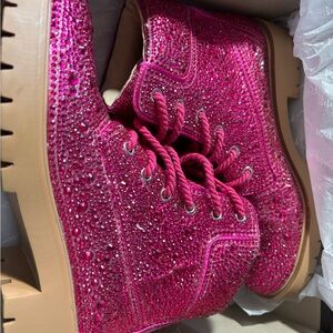 Dazzling fuchsia glitter boots with sturdy lace-up design. Add sparkle to your step.