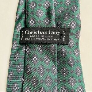 A paisley inspired geometric pattern adds interest to this vintage hunter green all silk necktie by luxury designer Christian Dior.