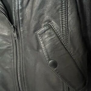 All leather, black biker jacket, black stitching, snaps, zippers. Zip front & wrist. Front pockets w/snap closure. Sleeve lining 100% acetate, body lining 100% cotton. Never worn.