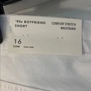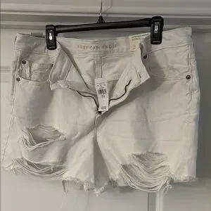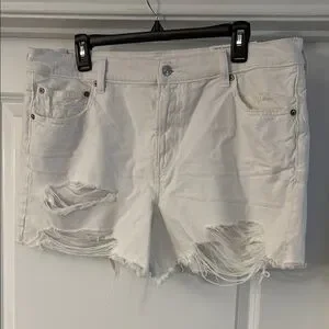 These white jean shorts from American Eagle Outfitters feature a comfortable, distressed design with a raw cut-off hem and frayed edges. The 90’s style boyfriend fit offers a relaxed fit perfect for casual summer days.
