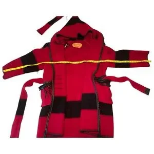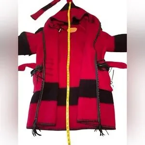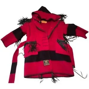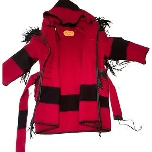 Rare, handcrafted hooded coat by Castillo Designs (Santa Fe, NM), made from a 100% wool Early’s Whitney Point blanket. This artisan piece features bold red and black striping, black leather fringe on the shoulders and pockets, a braided leather collar, whipstitch trim, and a cozy attached hood. Finished with a matching wool belt, this coat blends high-desert style with true functionality.