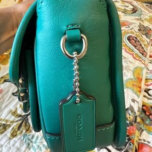 This Coach crossbody bag in a striking green hue combines elegance with functionality. Its structured silhouette and smooth finish make it a versatile accessory for any occasion. The matching strap ensures comfort and style, making it a must-have for your collection. Mesurements: 7.5in wide, 6in height and 2in deep. You can fit cell phone, small wallet, lipstick and car keys, plus has a front and back small pocket 😉