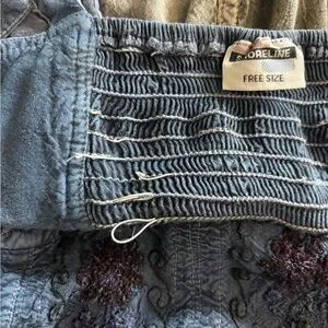 It features a beautiful blend of blue, tan and orange with embroidered flowers
