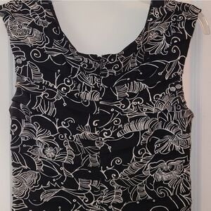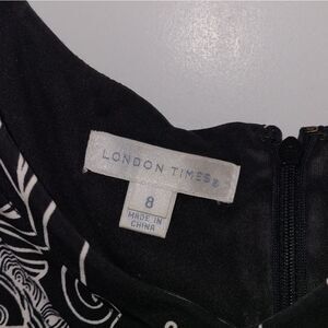 London Times Tiered Stretch Contrast Floral Sheath Dress in a size 8. Fabric has a layered ruched design that is forgiving at the waist with a v-neck. Center back zipper. Black with a contrasting white floral print. Excellent Condition.