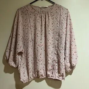 This Sienna Sky Pink Floral Blouse is cute for a very casual event or for office setting. The fabric is very thin and is recommended to wear a tank top underneath but you can wear it however you like! This blouse has a small button on the back by the neck area and has stretchy elastic bands around the sleeves and bottom of the shirt.